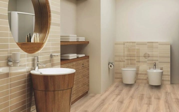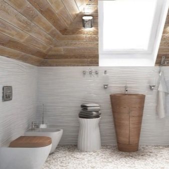 Another example of a combination of white with natural wood. In a rather spacious bathroom, you can install a toilet, bidet and sink.