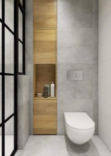 - Minimalism. In this case, it is necessary to select materials and plumbing in white, black and gray colors. Such designs are laconic and very accurate. At the same time, plumbing should be as modern as possible, it is better to select built-in models.