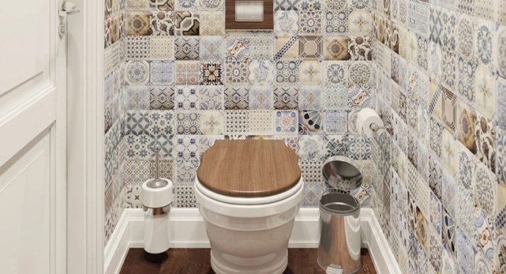 You can take as a basis a gray-blue color, designing panels in it 1-1.5 m high and a facade that hides communications. The wall opposite the entrance can be tiled with design patchworkmade in bright colors, in harmony with the gray-blue hue of the panels.