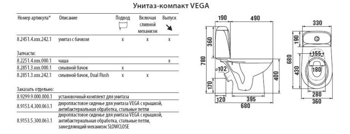 - Toilet bowl compact Vega 36x68 cm, lower eyeliner, oblique outlet, without seat. This option is made of high quality ceramic. The combined type model is designed for outdoor use. It has a vertical flush, oblique outlet and lower water supply and is presented in one color - white.