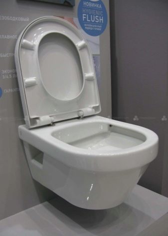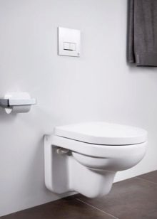 - Gustavsberg Hygienic Flush. The bezelless model of the Swedish brand is made of porcelain in snow-white color. The seat cover is made of duroplast. The design involves horizontal drainage of water, there is an anti-splash system, as well as a micro-lift. Chrome mounts. Installation with a tank and all accessories necessary for them is purchased separately and installed covertly. The model does not assume the presence of a rim, which means that no dirt accumulates on the edges of the bowl. The absence of legs makes it possible to freely access the floor under the bowl.