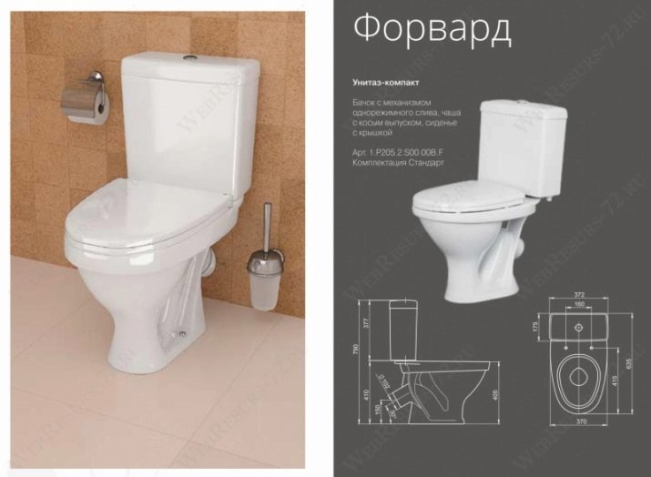 The Forward toilet bowl model is presented only as standard equipment. It has a single-mode drain, lower water supply and oblique outlet. Product weight - 28 kg. The kit also includes a polypropylene seat with plastic fasteners. Dimensions - 635x370x790 mm.