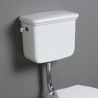 Older cistern models connected to the toilet casing with a two-meter pipe also belong to this type of reservoirs and provide better flushing in comparison with compact models. High flushing efficiency is due to the greater speed of the water flow entering the bowl from a sufficiently high height.