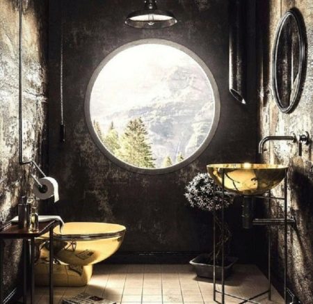Loft. This industrial style, at first glance, does not seem at all suitable for such a piece of furniture. However, the main concept of the loft is a combination of rough finishes and luxurious details. Golden plumbing can be a real highlight of such a bathroom. Demonstratively untreated concrete flooring, masonry walls emphasize the richness and splendor of furniture, plumbing.