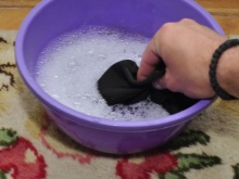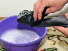 - Then in a small bowl of warm water you need to dissolve a liquid soap containing any oil (ginseng oil, lavender, and so on). You can also use a special stain remover, which can be purchased at any household chemical store.