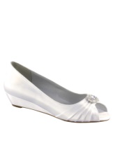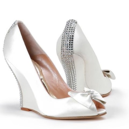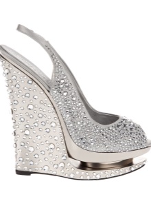 Snow-white wedge shoes with silver sequins look elegant. Models with an open toe and a luxurious bow in the heel area look romantic.