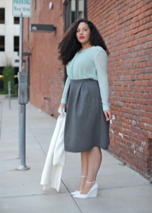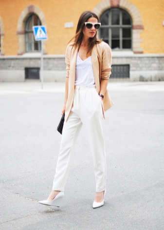 A cream jacket or a white shirt in tandem with a skirt below the knee made in beige or milk color looks elegant and sophisticated. Refined wedge shoes will become a worthy final element of a business image.