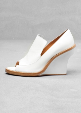 Thanks to various tricks, designers create elegant and unusual models of white shoes. So, the wedge on the sides can be concave. Models with a transparent platform sole look very impressive. Such shoes give the silhouette airiness and lightness.