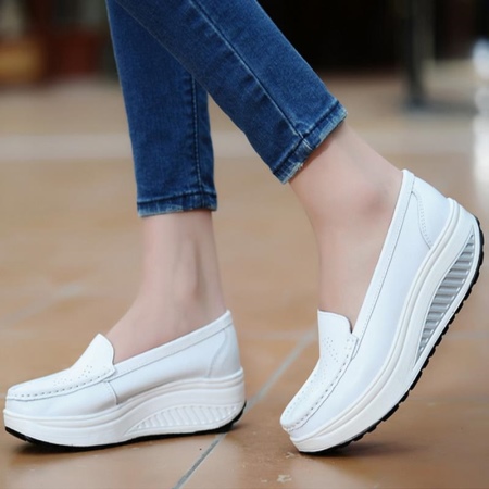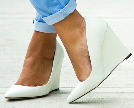 White shoes with wedges are ideal for an everyday look. They should be combined with shorts, capri pants or mini-length skirts, with dresses or maxi-length sundresses.