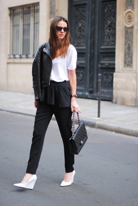 Many worn white wedge shoes with black trousers. The highlight in the image will add a luxurious blouse. A leather jacket and a stylish handbag on a chain will complete a fashionable look for every day.