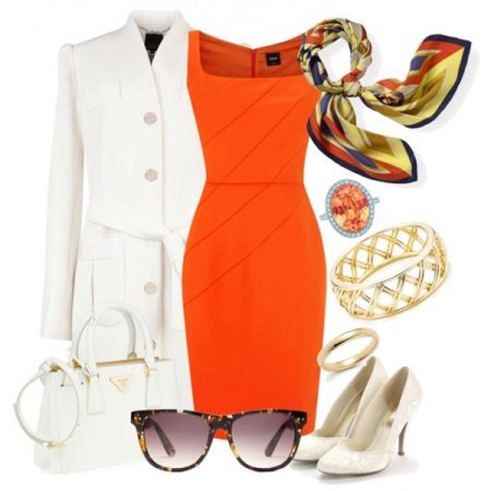 No less relevant is the combination of white and orange. It is not necessary to wear only a dress with white shoes, although such a combination will look stylish and sexy. You can add a color accessory - a bag, earrings, a scarf or something else, as you wish.