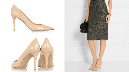 Dresses made of light materials will be the perfect complement to beige pumps. For the summer, you can choose a stylish pair of shoes with an open toe. You can combine patent shoes with dresses of different colors.