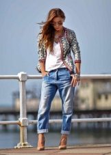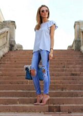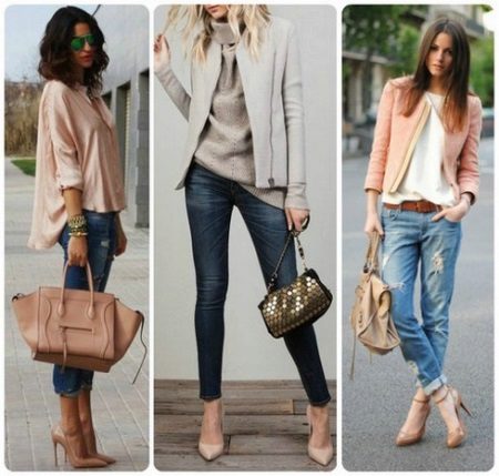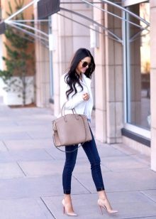 Pink and beige stiletto heels look stylish with cropped dark jeans. A white top is chosen for jeans, it can be anything: from a sweater to a jacket. Boats in this image are complemented by a clutch of the same shade.