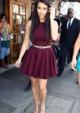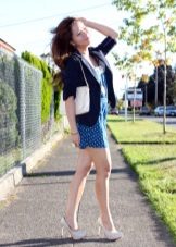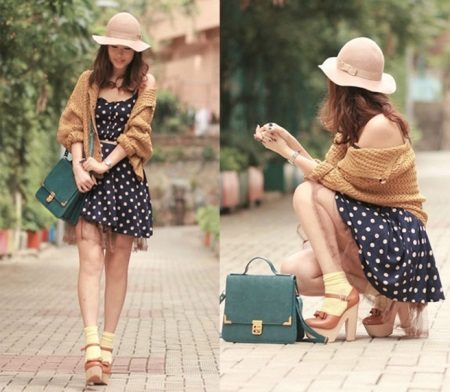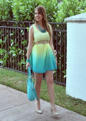 The yellow dress with contrasting bright blue decorations looks amazingly bright. The image is successfully completed by flesh-colored shoes. They certainly attract attention, but not to themselves, but to the feet of their mistress.