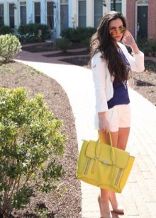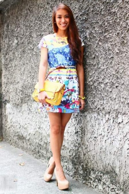 The image is in casual style. The bright fabric of the dress is balanced by solid beige high-heeled shoes. The yellow bag is not matched to the shoes, but to the yellow color on the print. A noble combination of black and pink-beige.