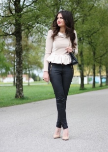 Almost any beige wedge shoes, with the exception of models with an open heel, will look good with trousers and jeans. Torn boyfriend in combination with a t-shirt and blazer are suitable for everyday wear, in skinny you can go to a party, complementing the look with a stylish top. Classic trousers are ideal for work in combination with a shirt and a jacket.