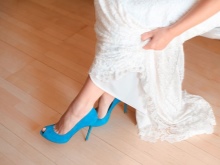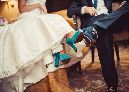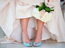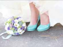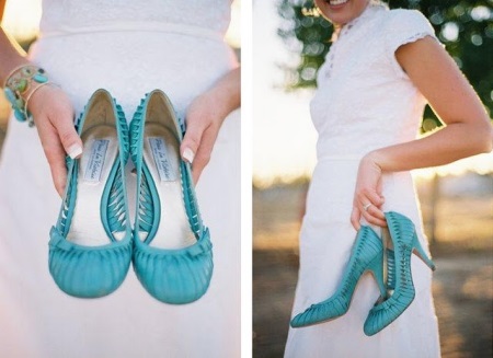 Turquoise shoes are combined not only with a white dress of the bride, but also with a dress of champagne color, pale pink, light beige. The image will be finished and chic if you complement the turquoise shoes with an accessory in tone. You can add turquoise to the bride's bouquet, or, as one of the most daring and unexpected decisions, choose a veil in turquoise shades.