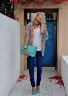 To reveal the image most deeply, you can choose jewelry with stones of the same color scheme for turquoise shoes, for example, topaz or turquoise. Such accessories will look great with white trousers and a light tunic with a print of blue or blue.