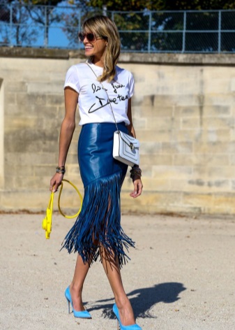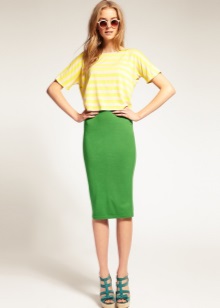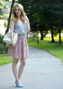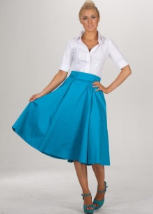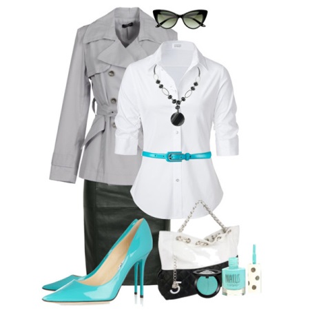 If you take the classic version of a black skirt and a white blouse, add turquoise high-heeled shoes and a thin belt of the same shade to them, you get a very interesting option for work. You can also complement the kit with a tie or neckerchief from a blue-green color palette.