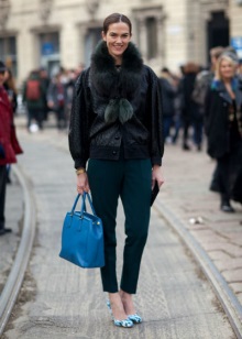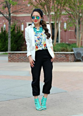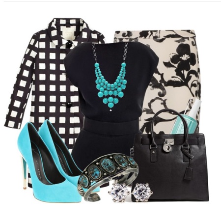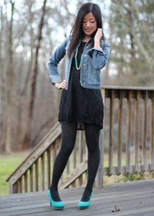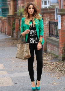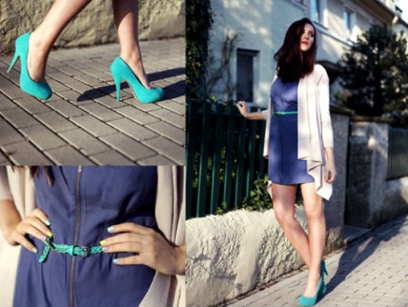An ordinary black blouse can easily be turned into a fashionable bow, adding accessories and turquoise shoes to it. For those for whom the option of dominating black seems too dull, there is an easier option. For example, a black dress, necklace and shoes in turquoise, as well as a jacket of white or pale blue.