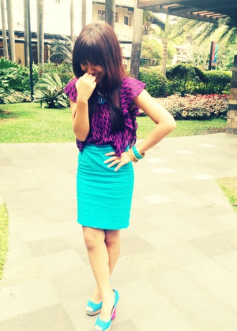 Blue-green shoes, a green dress and a purple jacket are both bright and interesting and quite simple combination. A bow that combines a light blouse, a long purple skirt, turquoise ballet shoes and a green handbag will look unusual.