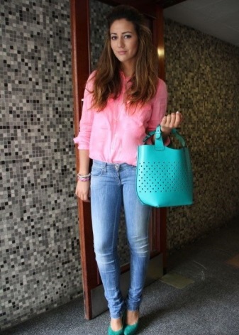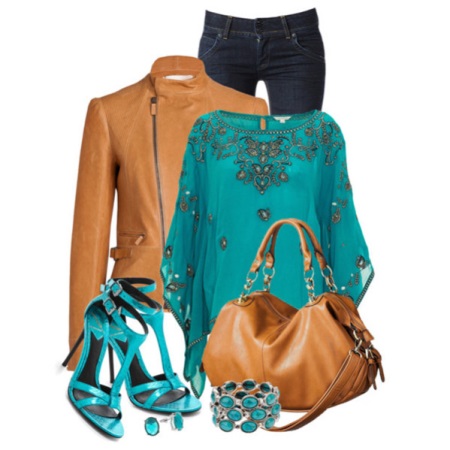 Turquoise and blue look great in pairs. An example of a very successful and at the same time simple bow is blue jeans and turquoise shoes, a cream blouse and jewelry with turquoise or a belt of the same color as the shoes. So that the daytime image is not overloaded with color, it can be diluted with a light jacket. And if the exit is planned for the evening, then the color of silver will give the bow brightness and chic.