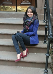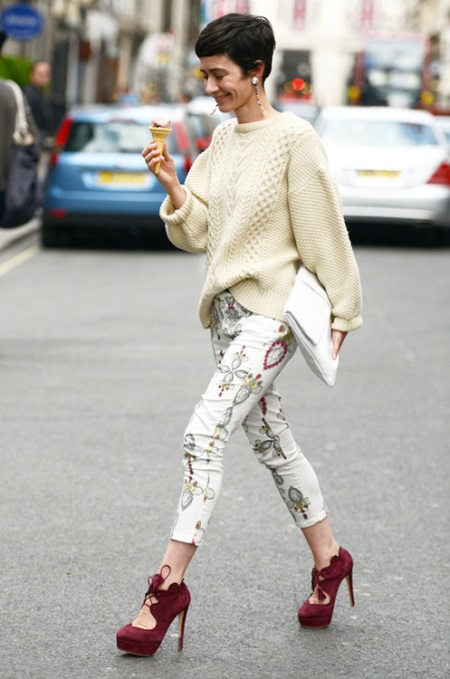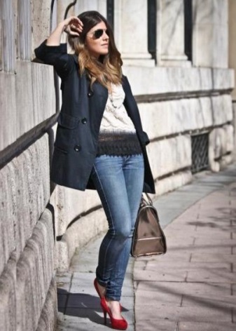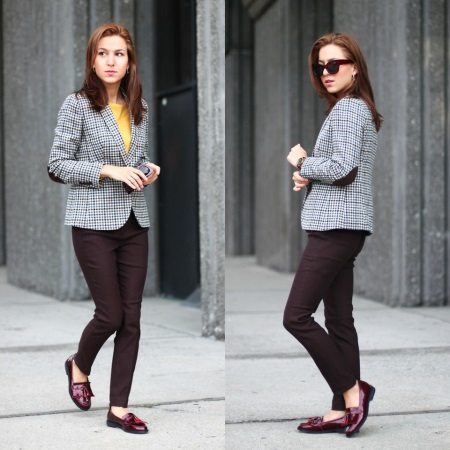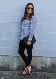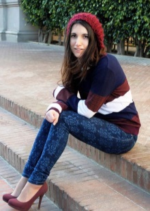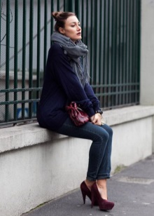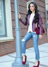 Shoes in burgundy will work well with blue jeans, especially if the burgundy is in the colors of outerwear or accessories (the color of a bag, belt, headgear). The presence of accessories of the same color always makes the image more harmonious and thoughtful.