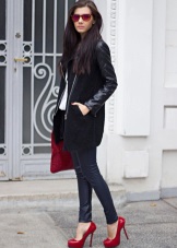 The combination of burgundy shoes with black tight trousers is suitable for everyday style, and may also be appropriate at a party: it all depends on the height of the heel and the style of the shoes, as well as on other things in the ensemble.
