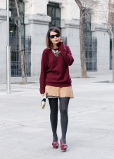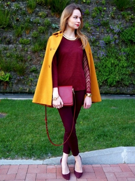 The color is burgundy and yellow. Shoes of Bordeaux color can be chosen to clothing shades of yellow. This combination repeats the natural colors of autumn landscapes. A combination of mustard and burgundy is considered classic.