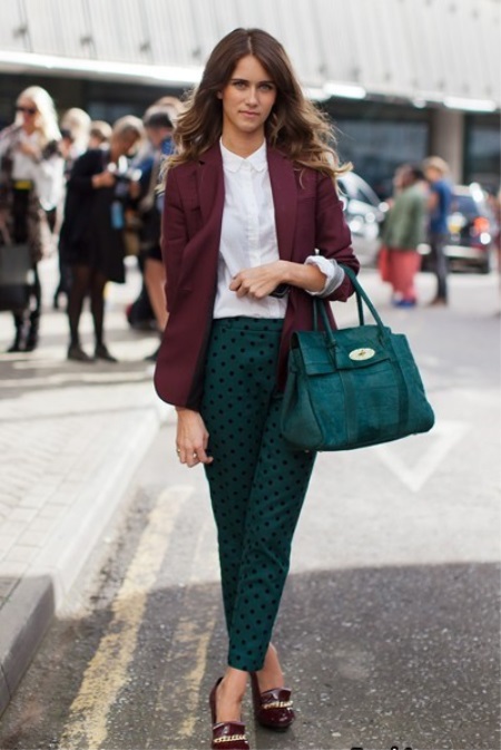 With clothes in shades of blue and green, it is quite possible to wear shoes in Bordeaux. In this case, accessories of the same color will always be appropriate. A bright accent will be burgundy shoes if you combine clothes according to the principle of white plus black or black plus white.