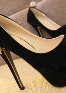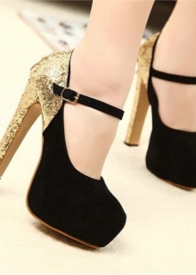 Extremely spectacular are the black suede shoes of this model. Various metal buckles and a scattering of rhinestones often act as decoration. The heel can be made in a different color or material than the main array of shoes. Shoes, whose thick heel is executed in gold color, are considered a popular model.
