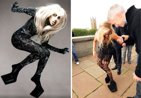 More recently, a Japanese innovator in the fashion world, Noritaka Tatehan has brought to light such an extravagant accessory as flat shoes. The main array of such a product is equipped with a stable structure in the form of a high platform, while the heel literally “soars” in the air. From the outside, such a model looks extremely unstable and doubtful. It is unlikely that anyone would dare to walk down the street in it, perhaps that is why these shoes so interested Lady Gaga, behind whom other lovers of shocking soon pulled themselves together.