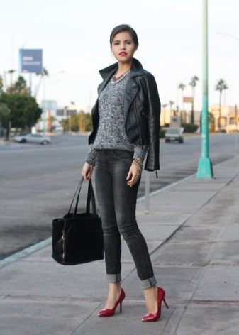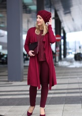 The gray color itself is quite concise and modest. An outfit of such a boring hue, diluted with charming Marsala slippers, visually revives and becomes more saturated.