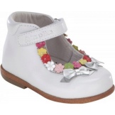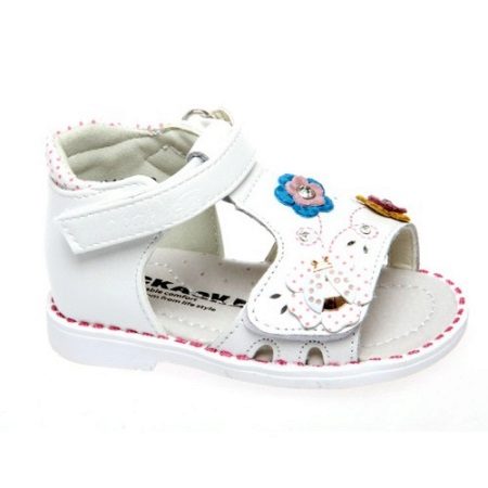 Charming shoes for the little women of fashion from genuine leather in white. An open toe, a stiff heel, a small flat heel, a jumper with Velcro - all this will make wearing shoes convenient and comfortable for a hot summer. The contrasting stitching of the seams in pink serves as a beautiful decor, as do the leather flowers in delicate pink and turquoise. Suitable for girls from 0 to 2 years.