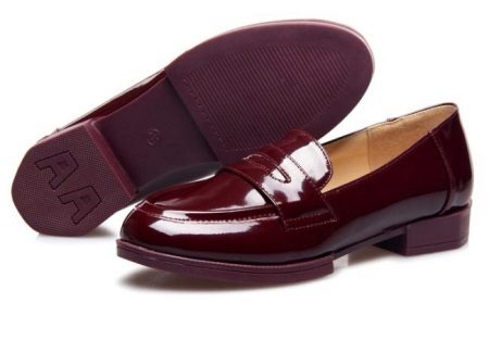Fashionable noble burgundy patent leather loafers are suitable for teenagers to wear everyday. A comfortable 2cm flat heel and a wide round toe, the absence of clasps and laces give the model versatility. Suitable for girls from 13 years old. These shoes can be worn with a skirt, dress and trousers.