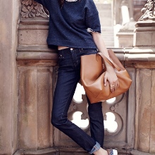 - The combination of jeans with metal or leather looks elegant. Such contrasting materials can be embodied in decorative trim, inserts, straps or replace a separate part of the top (sock, back).