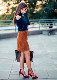 Graceful pumps from nubuck look harmonious with both youth jeans and strict trousers. Upstairs you can wear a classic white shirt (if it comes to business style) and complement it with a contrasting jacket or jacket.Delicate blouses made of flowing fabrics in an ensemble with skinny jeans or straight skirts will look very feminine and romantic with velvet boats. Light dresses with wide and straight falling skirts in combination with nubuck shoes will look very elegant and fresh.