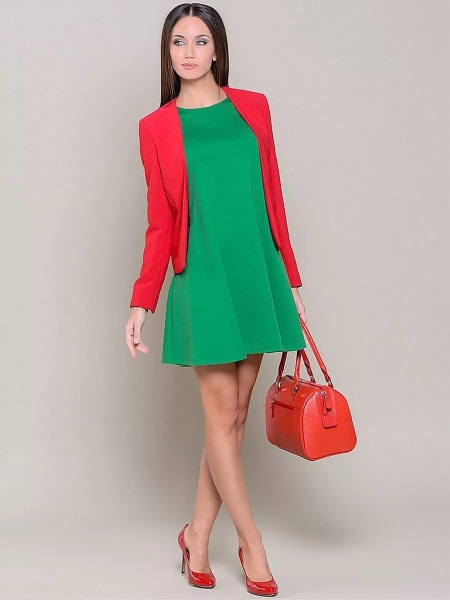 But in this image, everything is fine. Red elements resonate with each other, and a green dress serves as a shading and soothing element. The shade of the dress corresponds to the color type of the model, which is also important. Pay attention to the lack of decorations and decor. In such an expressive way such elements would be absolutely superfluous.
