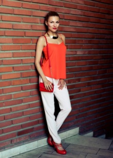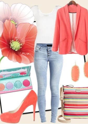 - Black trousers or jeans with a light or white top will create a wonderful casual look along with coral-colored shoes. Also, a short jacket of orange, peach or beige color will perfectly fit into this image.