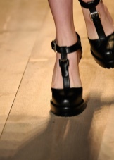 Leather models with a T-shaped strap are designed for special occasions and are often decorated with decor in the form of flowers, bows and even a scattering of crystals.