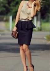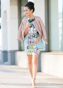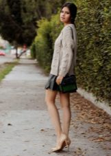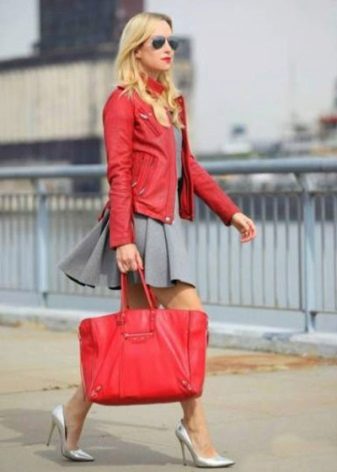 Here is an everyday urban image, but it is the shoes that make it bright and original. Classic stilettos are made in a beautiful bright pink color, which enlivens the entire ensemble in black and gray colors. A high stiletto heel makes the leg slimmer, and the color of leather shoes echoes the shade of lipstick. The blouse of a simple style is complemented by a trapeze skirt of an interesting volumetric texture of the fabric. A small handbag with a long strap and sunglasses successfully complete this feminine image.