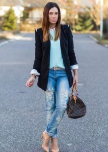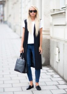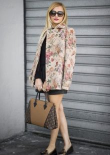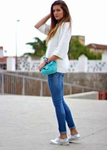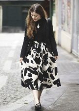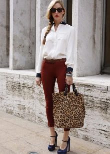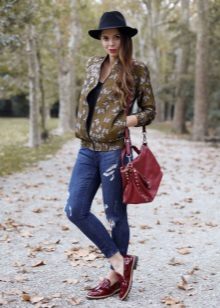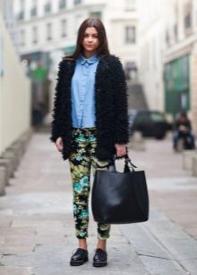 Men's oxford shoes are a great option for the fall. A thick sole and a small square heel make this model very practical, and an interesting design with black and white printed fragments enlivens the ensemble. Shoes are successfully combined with skinny jeans, a blouse and a light cropped coat without a collar.