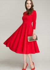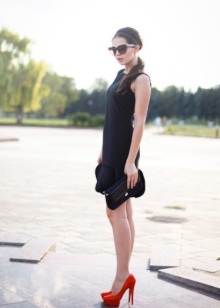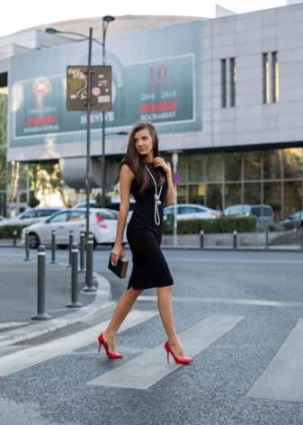- Black dress is the most favorite option for creating images with red shoes. When creating such an image, there is a risk of not guessing with style and length, but women still love this combination. The most successful choice would be a low-key midi dress without crazy cuts, bright decor and lace. A bright accent of this image is already selected - these are shoes. This means that all other components should be modest and simple. Of great importance is the combination of the material of the dress and the texture of the shoes. Satin shoes must be worn with silk or satin, in a word, with smooth material. Under suede shoes, you must choose knitwear, velvet.