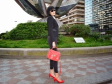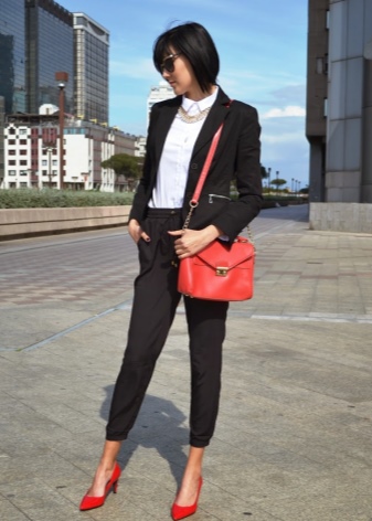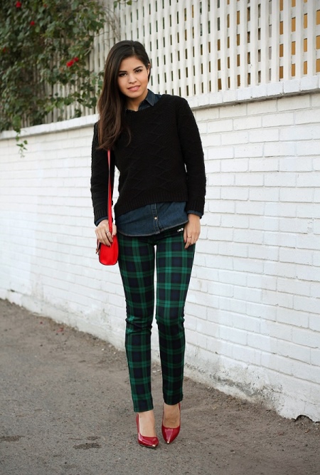 And here is the image for every day, which is also based on red pumps. They are the main element that sets the mood. The red handbag is very welcome here.See how harmoniously checkered pants look with vibrant shoes. But we talked about this above!