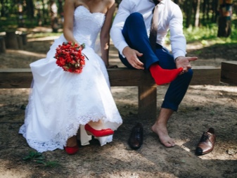Using red shoes in a classic look requires the addition of another red accessory. You can add a red belt to the dress, choose a red veil or order a bouquet of red roses from florists. Such subtleties must be demolished not only in your image, but also in the image of the groom. It is still simpler here. Red color can be embodied in a handkerchief, tie or buttonhole.