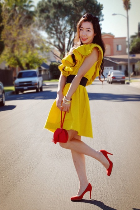 - A monochrome cell in a skirt or trousers looks good with such bright shoes.