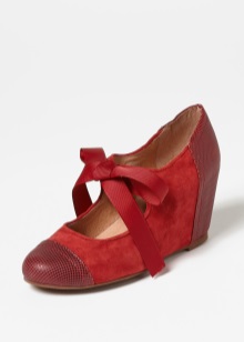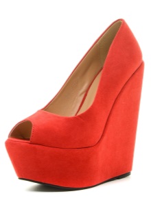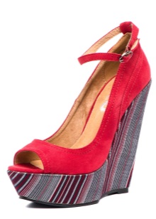 Models of wedge shoes look especially coquettish and romantic with a thin ankle strap, which is sometimes decorated with a small suede or textile bow. Wedge-heeled shoes, complemented by metal spikes, colored stones and rhinestones, allow shoes to look very original and expensive. Unusual and extravagant look models of red shoes on a wedge with a neckline, but such shoes should be selected especially carefully and not be mistaken in size.