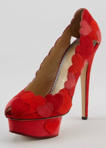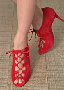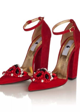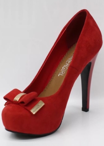 Designers often decorate red suede high-heeled shoes with metal voluminous details, lace stripes, heel and sole design in contrasting black, as well as bows on the toe and golden clasps.