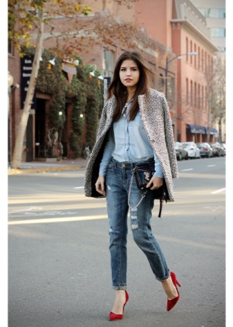 The noble red color of suede shoes allows you to pick up quite a lot of bright and attractive accessories that perfectly complement the stylish female look.