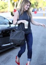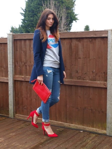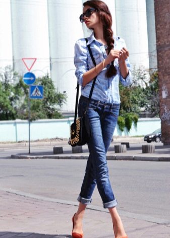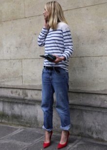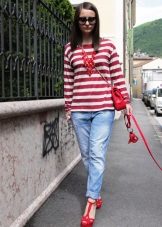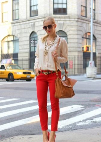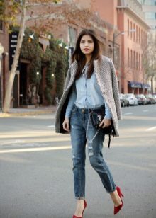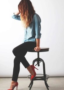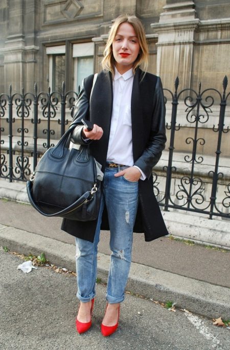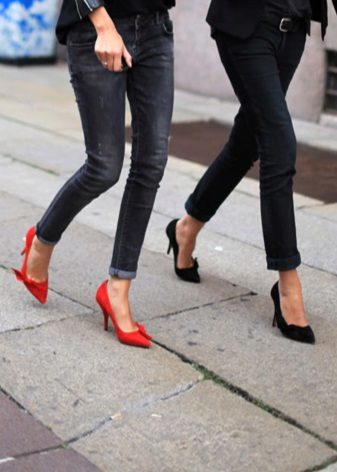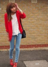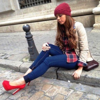 Red shoes are perfectly combined with tight jeans, absolutely any shades, with any decorative elements. It is thanks to this combination that the image turns out to be juicy, bright and bold.